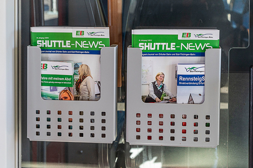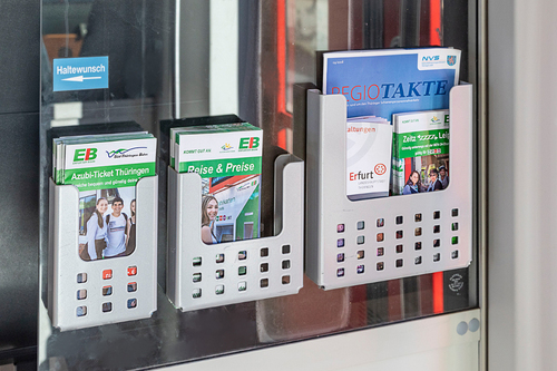Prospekthalter in verschiedenen Formaten, z.B. für DIN A4, A5, A6, DIN lang. Gefertigt aus 2 mm Alu-Blech, vorderseitig individuelles gelasertes Design, nach Ral pulverbeschichtet, stoßfest, zum Kleben oder Schrauben. Für den Einsatz in Bussen oder Zügen.